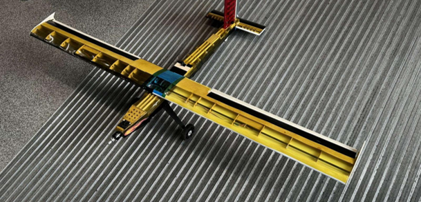 The AEROLITE is an ultra-light fixed-wing UAV, hand-built using balsa wood, lightweight plywood, and a flexible plastic-film outer shell. Weighing just 1 kg, it is designed for low-cost operations with the capability to carry up to 4 kg payload—an impressive 4:1 payload-to-weight ratio.